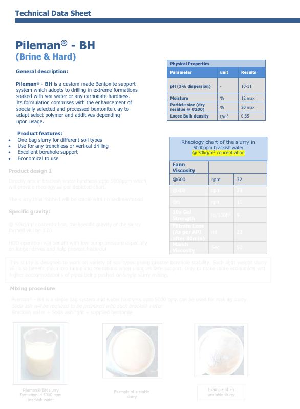 However good a slurry may be but if exposed to ground where there are extreme chlorides or sulphites or carbonates, the slurry will immediately meet with the ions only to flocculate or sediment. The result will be non impermeable formation of filter cake compromising the very process of drilling PILEMAN® BH is designed to counter such events in drilling. The detailed explanation on the attached Technical Data Sheet will only give you confidence on its formula and our knowledge to do so. Worth to mention that keeping economy as a primary factor, we are able to tailor make the rheology of the Pileman® BH.