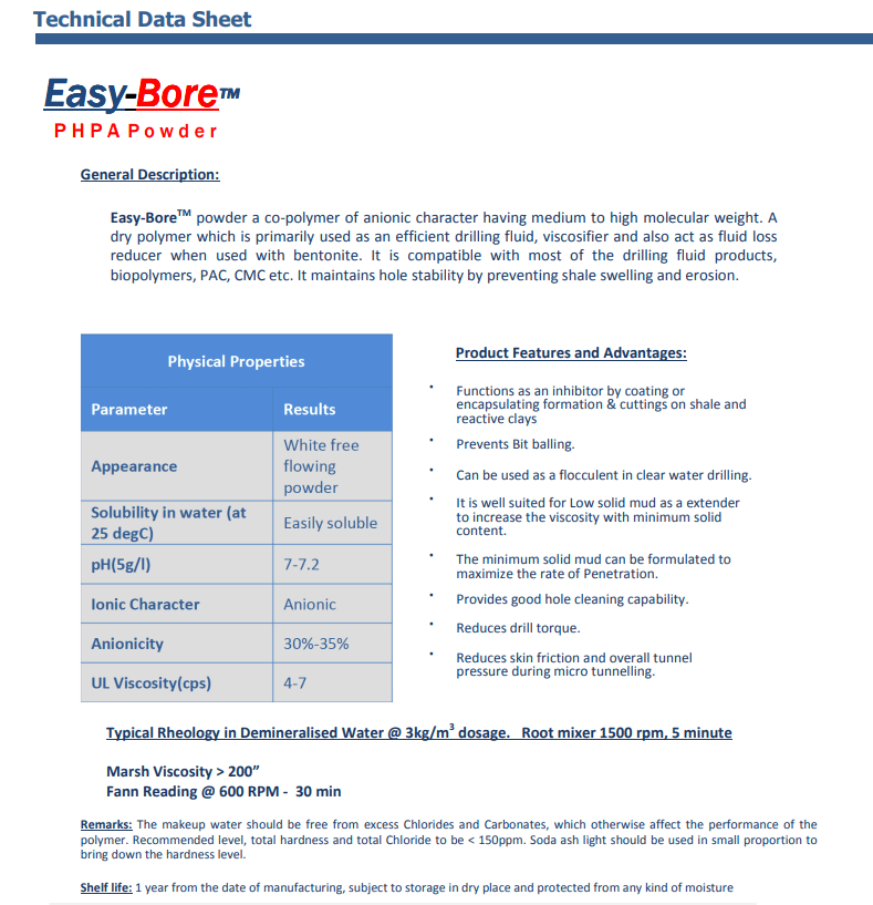 Easy-BoreTM is a powder phpa, is excellent polymer drilling fluid, a co-polymer of anionic character having medium to high molecular weight. A dry polymer which is primarily used as an efficient drilling fluid, viscosifier and also act as fluid loss reducer when used with bentonite. It is compatible with most of the drilling fluid products, biopolymers, PAC, CMC etc. This phpa powder maintains hole stability by preventing shale swelling and erosion.