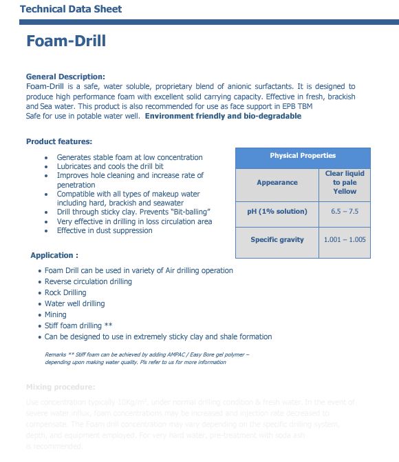 Foam-Drill is a safe foaming agent, anionic surfactant, water soluble, proprietary blend of surfactants. It is designed to produce high performance foam with excellent solid carrying capacity. Effective in fresh, brackish and saltwater. This product is high recommended for use as face support in case of EPB TBM.