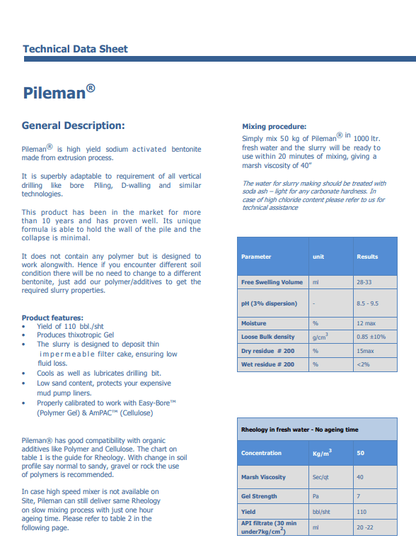 Pileman® is high yield sodium activated piling grade bentonite in India made from extrusion process. It is superbly adaptable to requirement of all vertical drilling like bore Piling, D-walling and similar technologies. This product has been in the market for more than 10 years and has proven well. Its unique formula is able to hold the wall of the pile and the collapse is minimal. It does not contain any polymer but is designed to work alongwith. Hence if you encounter different soil condition there will be no need to change to a different bentonite, just add our polymer/additives to get the required slurry properties.