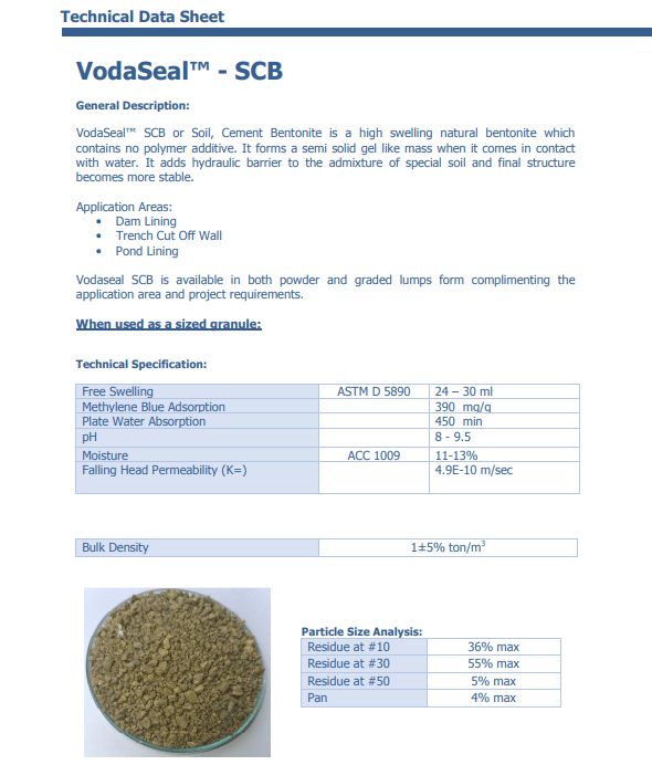 VodaSealTM SCB or Soil, Cement Bentonite is a high swelling natural bentonite which